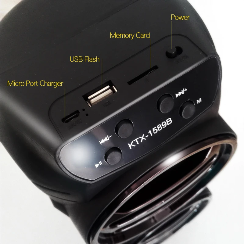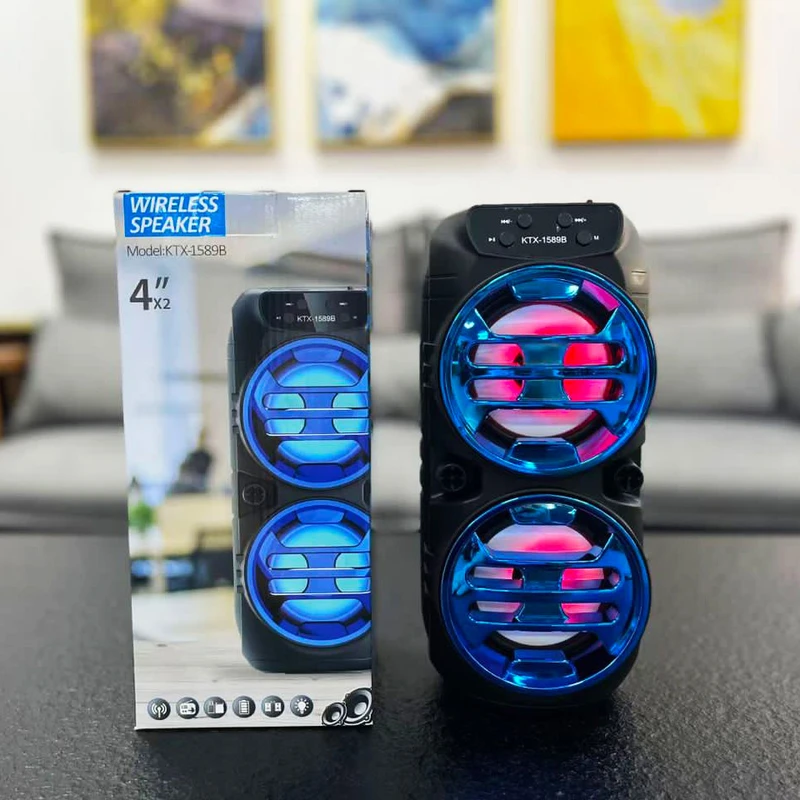 اسپیکر مدل KTX-1589-B با داشتن دو بلندگوی 4 اینچی با ابعاد 13.7x13.5x30.3 سانتی متر ، یک پرتابل اسپیکر با وضوح صدای مناسب برای مکانهای کوچک است که با ابعاد و وزن مناسبی که دارد قابلیت جابجایی راحت و استفاده در مکان های مختلف را برای شما فراهم میکند تا بتوانید از طریق بلوتوث / مموری کارت و یا فلش موزیک دلخواهتان را اجرا کنید و از شنیدن صدای آن لذت ببرید. داخل هر دو باند این اسپیکر چراغهای LED رنگی قرار دارد که زیبایی بیشتری به این اسپیکر می بخشد. باطری 1200 میلی آمپر اسپیکر تا بیش از یکساعت پخش موزیک با صدای بلند را برای شما فراهم میکند و برای شارژ کامل باطری 2 ساعت زمان نیاز دارد. این اسپیکر رادیو FM هم دارد که به کمک دکمه ها باید موجهای رادیو بصورت خودکار فعال شود. اما جذاب ترین قابلیت این اسپیکر اتصال دو اسپیکر مدل KTX-1589B به یکدیگر است ، هر دو اسپیکر را روشن و روی مدل بلوتوث قرار دهید ، دکمه M روی یکی از اسگیکرها را دو ثانیه نگهدارید تا صدای بوق را بشنوید ، حالا بلوتوث گوشی را به آن متصل کنید ، میبینید که صدای موزیک از هر دو اسپیکر پخش میشود