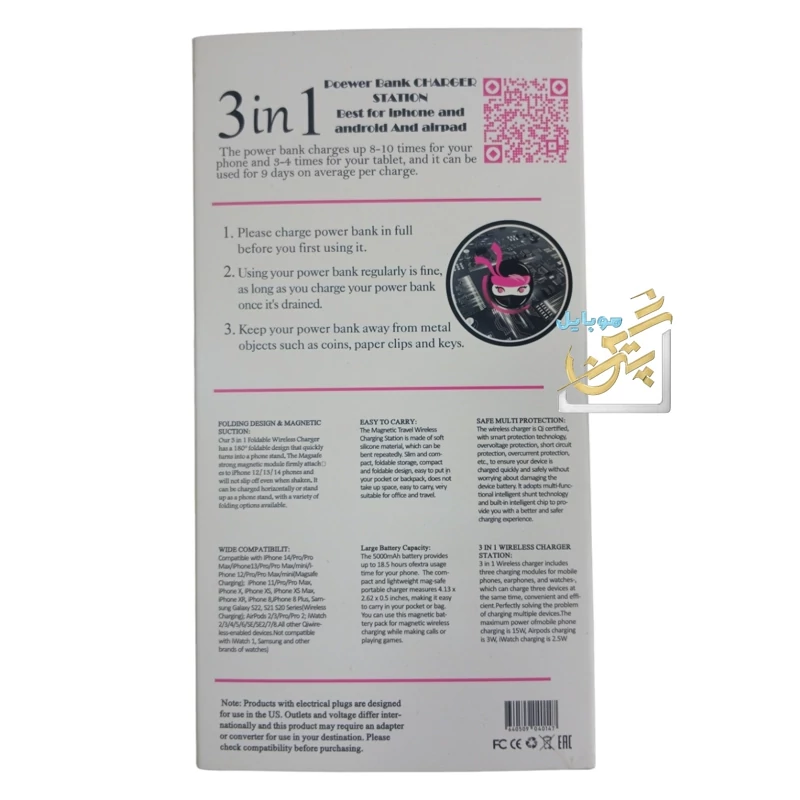این محصول با استانداردهای ایالات متحده طراحی شده. این محصول یک پاوربانک شارژر سهکاره (3 in 1 Power Bank Charger Station) است و دارای ویژگیهای زیر میباشد: سازگاری گسترده: قابل استفاده برای آیفون، اندروید و دستگاههای دیگر ظرفیت بالا: شارژ 8 تا 10 بار برای گوشی و 3 تا 4 بار برای تبلت، با عمر باتری 9 روزه در هر بار شارژ طراحی تاشو و اتصال مغناطیسی: سازگار با سری آیفونهای 12، 13، 14 و 15 و دستگاههای دارای شارژ 7.5 وات یا کمتر قابل حمل: ساخته شده از جنس سیلیکونی نرم و انعطافپذیر، مناسب برای دفتر و سفر ایمنی چندگانه: دارای گواهینامه Qi و سیستمهای محافظت در برابر ولتاژ بالا، جریان بیش از حد، اتصال کوتاه، کنترل دما و تشخیص اشیای خارجی باتری 20000 میلیآمپرساعت: تأمین 15 ساعت استفاده مداوم ایستگاه شارژ سهکاره: قابلیت شارژ همزمان آیفون (15 وات)، ایرپاد (5 وات) و اپل واچ (2.5 وات) نکته: این محصول با استانداردهای ایالات متحده طراحی شده.