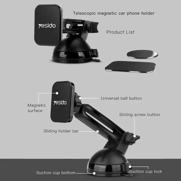 هولدر مگنتی یسیدو C36 است. یک پایه با قدرت مکش بسار بالا روی استند هولدر تعبیه شده که از طریق ایجاد خلع به سطوح می چسبد و به شما امکان این را می دهد که بتوانید پایه نگهدارنده را روی میز، روی شیشه یا قسمت جلویی خودروی خود قرار دهید. همچنین درون بسته بندی برچسب مخصوص آهنربایی قرار دارد که لازم است آن را به پشت گوشی موبایل خود بچسبانید تا گوشی به راحتی روی پایه آهنربایی هولدر قرار بگیرد. پایه هولدر مگنتی Yesido C36 بسیار محکم و مقاوم است و درون آن 4 آهنربا قرار گرفته است. وجود این 4 آهنربا سبب می شود که گوشی یا تبلت شما روی هولدر ثابت بماند. همچنین پایه این هولدر بصورت کشویی طراحی شده است و شما می توانید درصورت نیاز ارتفاع هولدر را تغییر دهید. ارتفاع این هولدر بین 15 تا 20 سانتی متر تغییر می کند. علاوه بر این بدنه هولدر قابلیت چرخش تا 360 درجه را دارد و می توانید آن را با زاویه دید خود تنظیم کنید. پایه هولدر نیز تا 240 درجه امکان چرخش دارند.