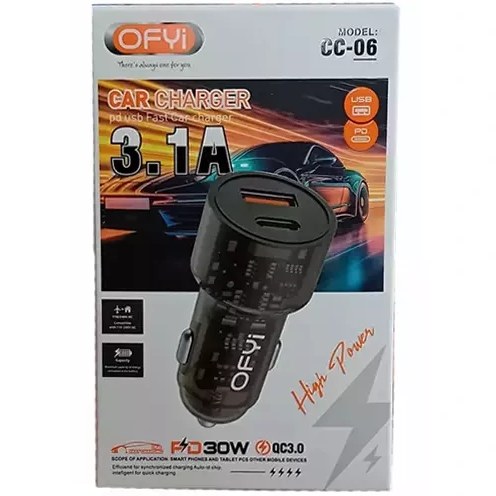 شارژر فندکی خودرو برند OFYI مدل CC-06 با خروجی سریع PD 20W و QC 18W، مجهز به پورتهای USB-A و USB-C، مناسب برای شارژ همزمان چند دستگاه با سرعت بالا. طراحی مقاوم و کاربردی، انتخابی مناسب برای رانندگی روزانه و سفر.